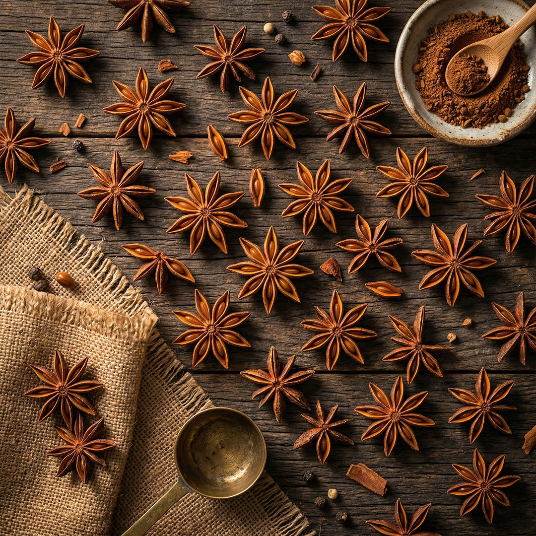 Star Anise is a distinctive spice known for its star-shaped pods, sweet licorice-like flavor, and strong aromatic profile. Commonly used in spice blends, seasoning mixes, beverages, and food processing industries, it adds depth and warmth to culinary preparations.